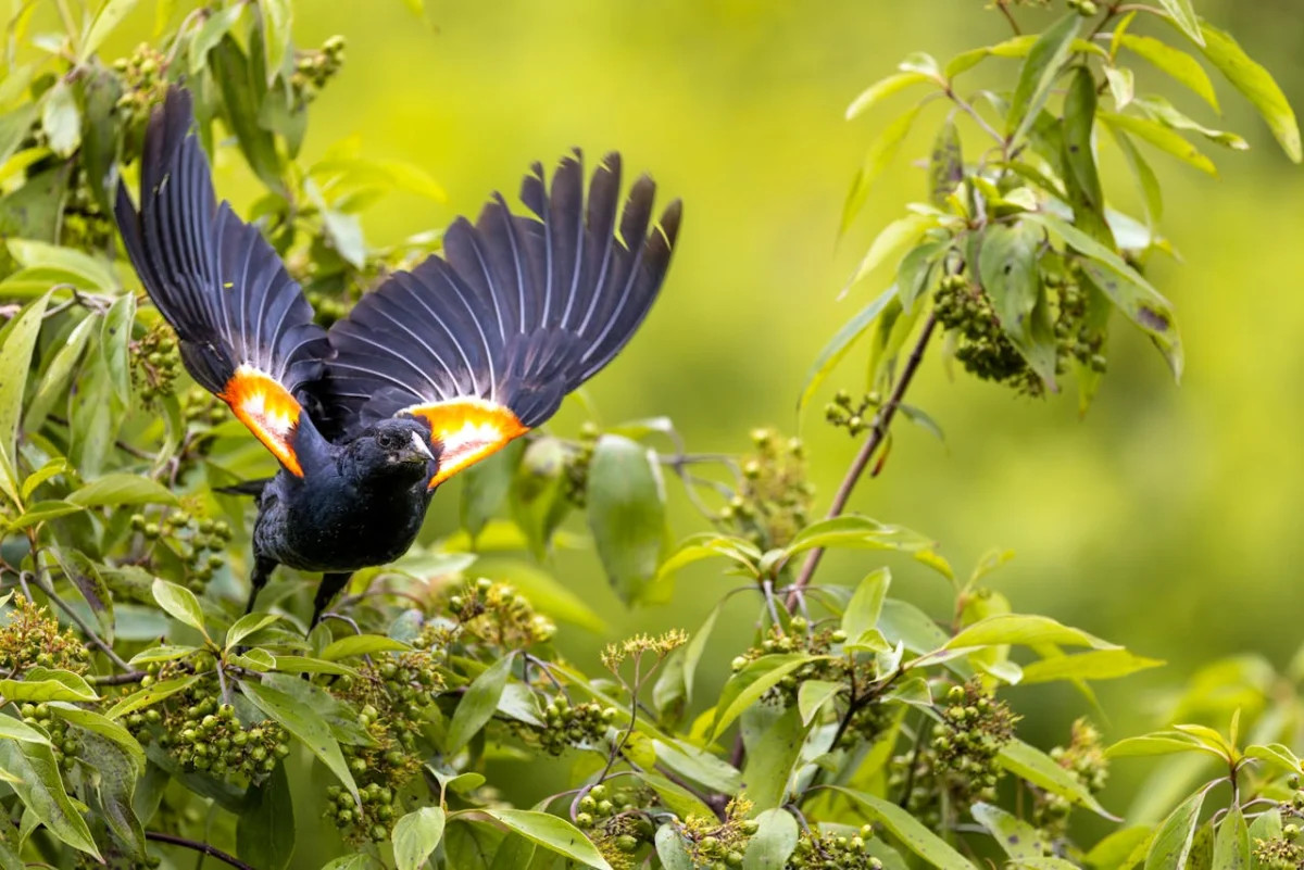 The Striking Palette of Nature: Black Birds Adorned with Fiery Red Wings
